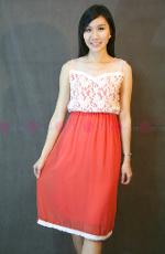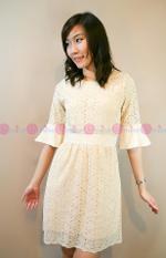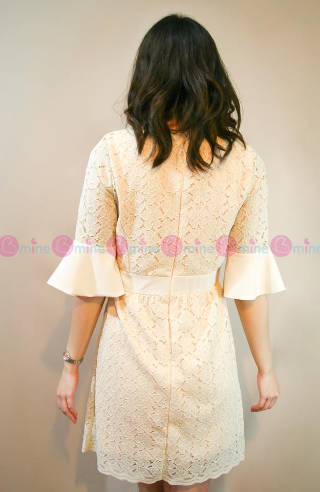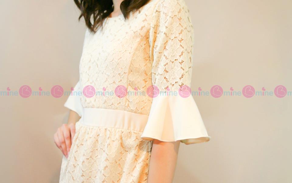 เดรสผ้าลูกไม้สีครีมแต่งผ้าระบายที่แขนเสื้อทั้งสองข้าง และคาดเอว ช่วยเน้นสัดส่วนมากขึ้น
