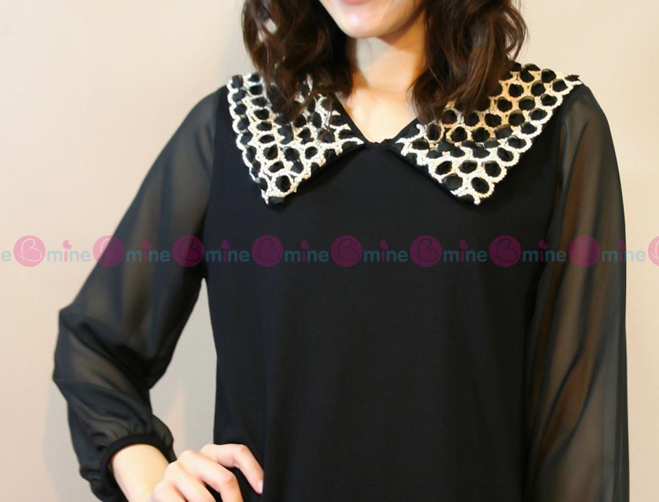 เดรสผ้ายืดสีดำ เล่นลูกเล่นที่ปกเสื้อด้วยผ้าตาข่ายแต่งเป็นดอกกุหลาบเล็กๆๆเรียงกัน