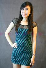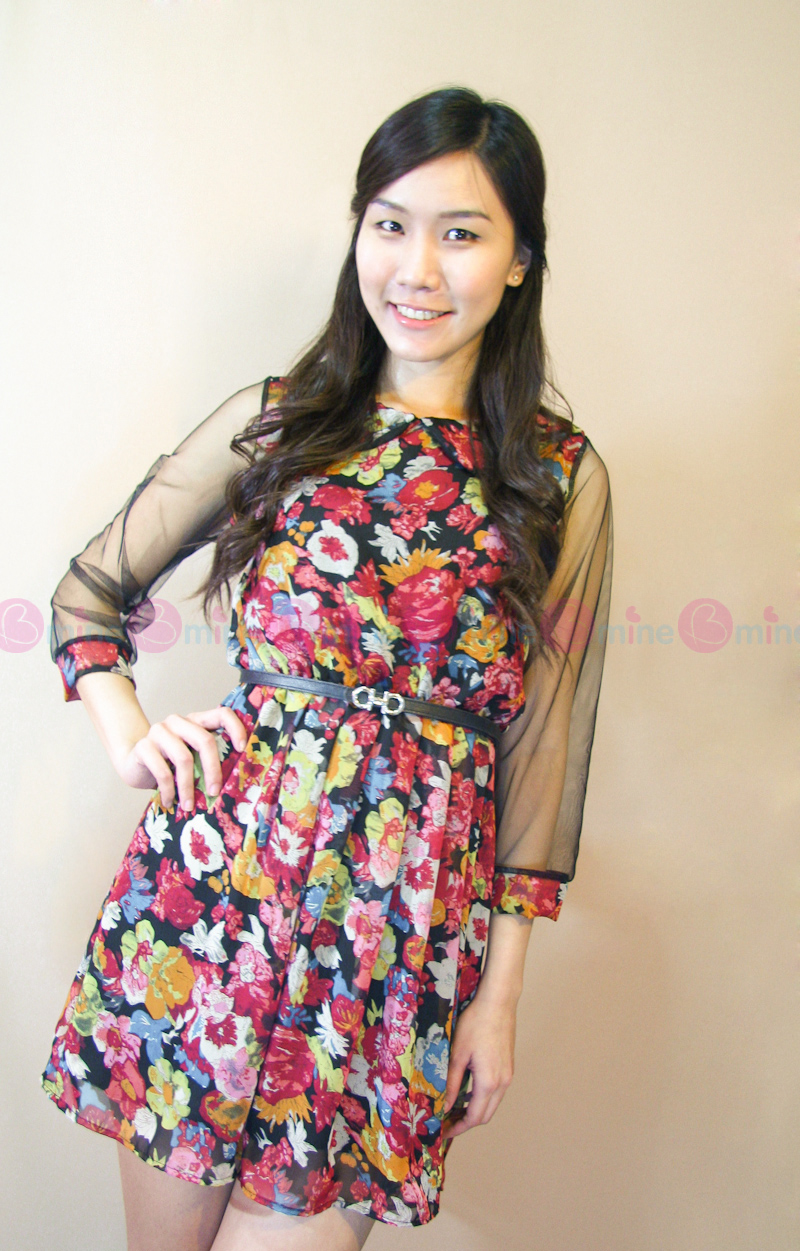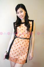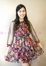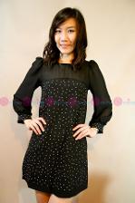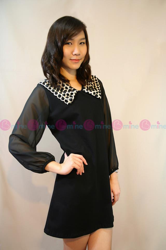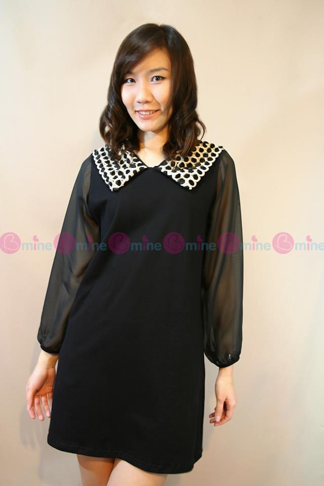 เดรสผ้ายืดสีดำ เล่นลูกเล่นที่ปกเสื้อด้วยผ้าตาข่ายแต่งเป็นดอกกุหลาบเล็กๆๆเรียงกัน พร้อมแขนเสื้อผ้าชีฟองสีทรูเพิ่มความเซ็กซี่เล็กๆ
