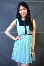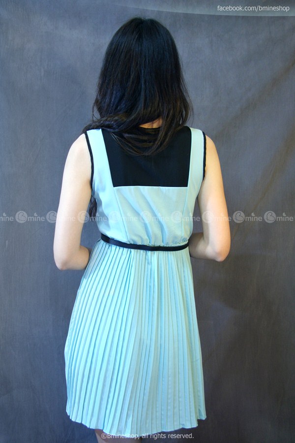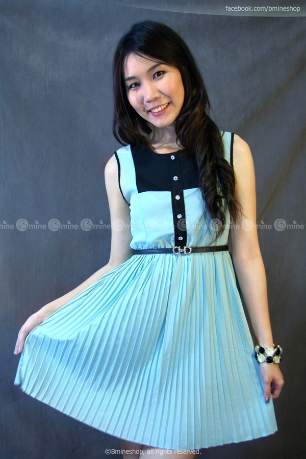 เดรสแขนกุด ผ้าหนังไก่เบาสบาย แต่งกระโปรงพลีท แต่งผ้าตัดต่อสีดำ และกระดุมเพชร เอวยางยืด มีซับในช่วงกระโปรง
