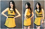 เดรสสีเหลืองมัสตาร์แขนกุด แต่งแถบสีดำช่วงอก เอว และชายกระโปรง